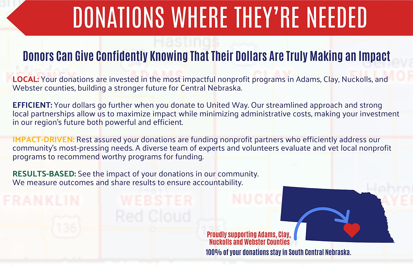 Our mission is simple: we find out where our neighbors need a hand, gather the resources to help, and pour them back into the four-county (Adams, Clay, Nuckolls & Webster) area we call home. By bringing together big-hearted donors and local volunteers, we’re building a community that’s not just stronger, but kinder and healthier for everyone.